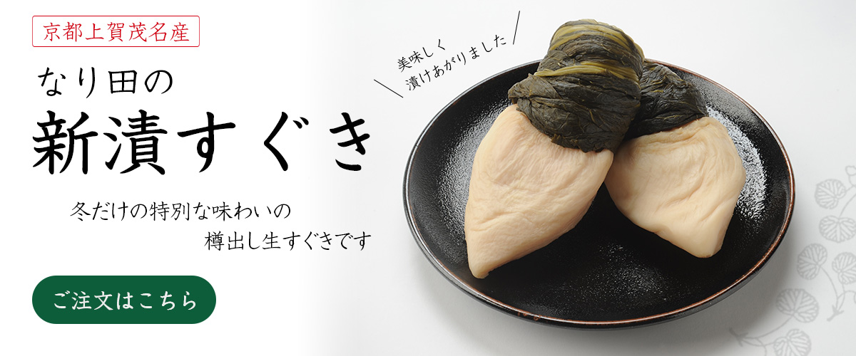 お店の正式な名前は「御すぐき處京都なり田」。先代の社長が「昔ながらの正統な製法ですぐきを作りあげていることを明確にしたい」との気持ちから名づけたものです。