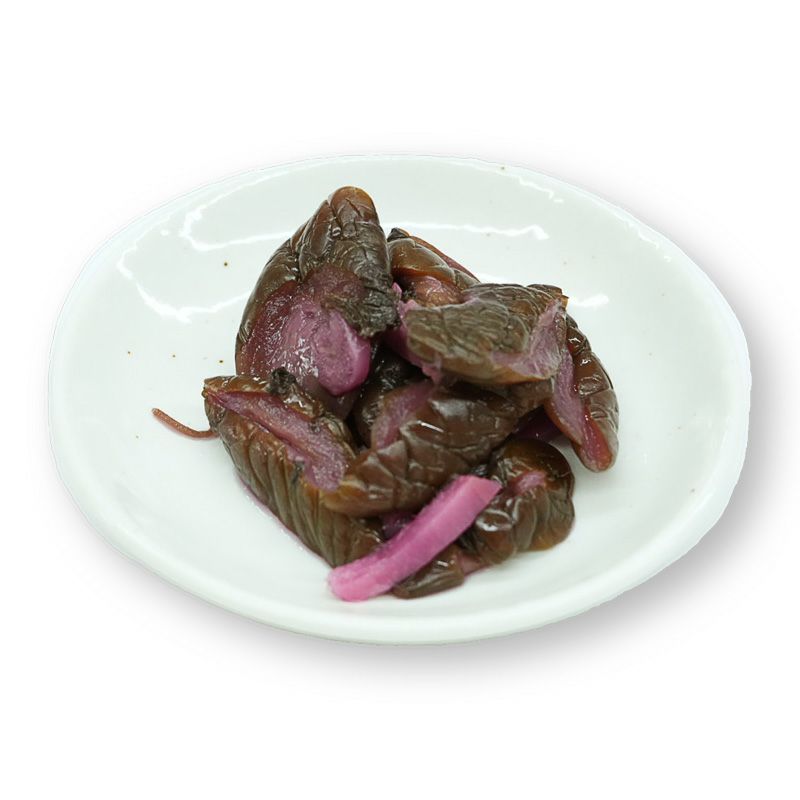 きゅうりを中心にしそやみょうが、生姜を加えて、さわやかに味付けしたしば漬けです。ぽりっと食感でどなたさまも召し上がりやすく仕上げています。常温保存ができるので手土産におすすめしております。